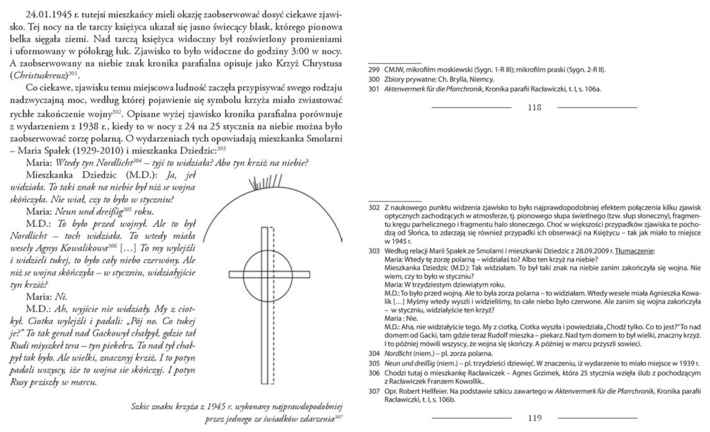 Na początku, w formie tekstu, przytoczę rozmowę z 28.09.2009 r., w której uczestniczyły: Maria Spałek (1929-2010) ze Smolarni i jej kuzynka Hildegarda Rogosz z Dziedzic. Mieszkanki te rozmawiały zarówno o zorzy polarnej z 1938 r., jak i o znaku krzyża na tarczy Księżyca. Od razu zaznaczę, że poniższy tekst, w odniesieniu do wersji opublikowanej w monografii Smolarni, został poprawiony o pewne błędy i nieścisłości w pisowni.